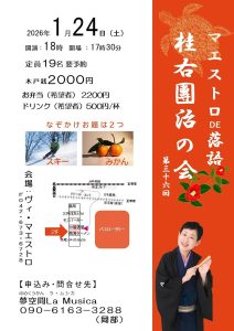 2026年1月24日(土)17:30開場/18:00開演 場所:高尾・ヴィ・マエストロ =出演= ・桂右團治 木戸銭:2,000円 お弁当(希望者)2,200円 ドリンク(希望者)500円/杯 定員:19名(要予約 09 […]
